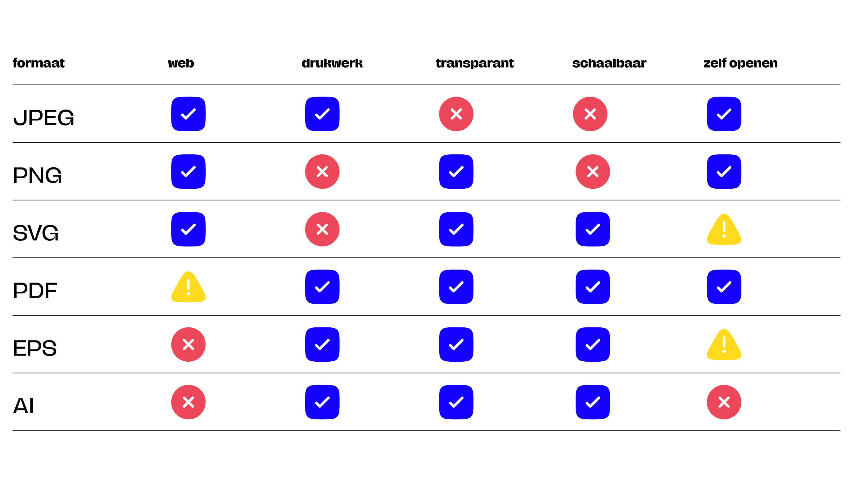 Let op: Om SVG-bestanden te gebruiken, is meestal ontwerpsoftware of codekennis nodig. Sommige verouderde systemen of tools kunnen SVG's ook minder goed ondersteunen.