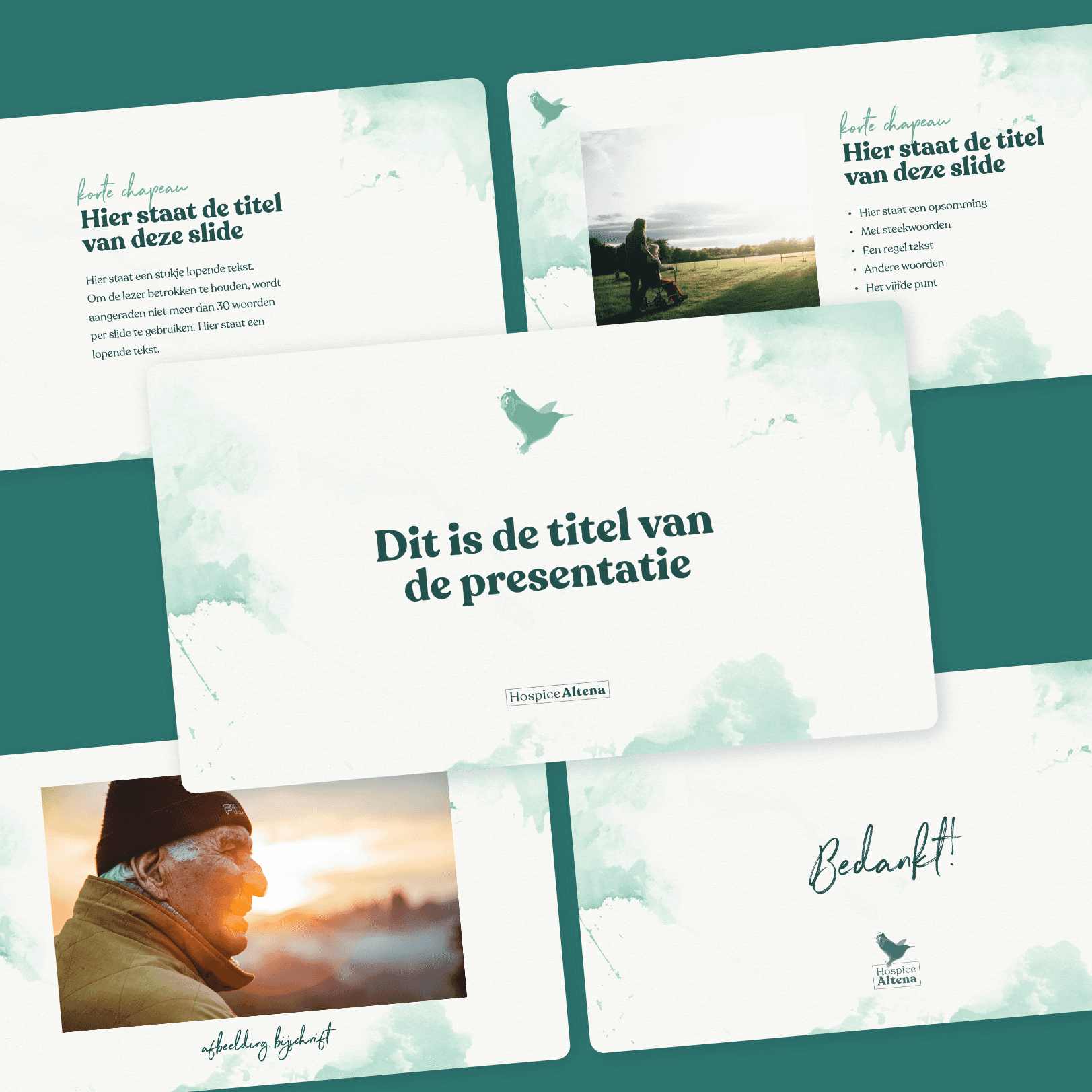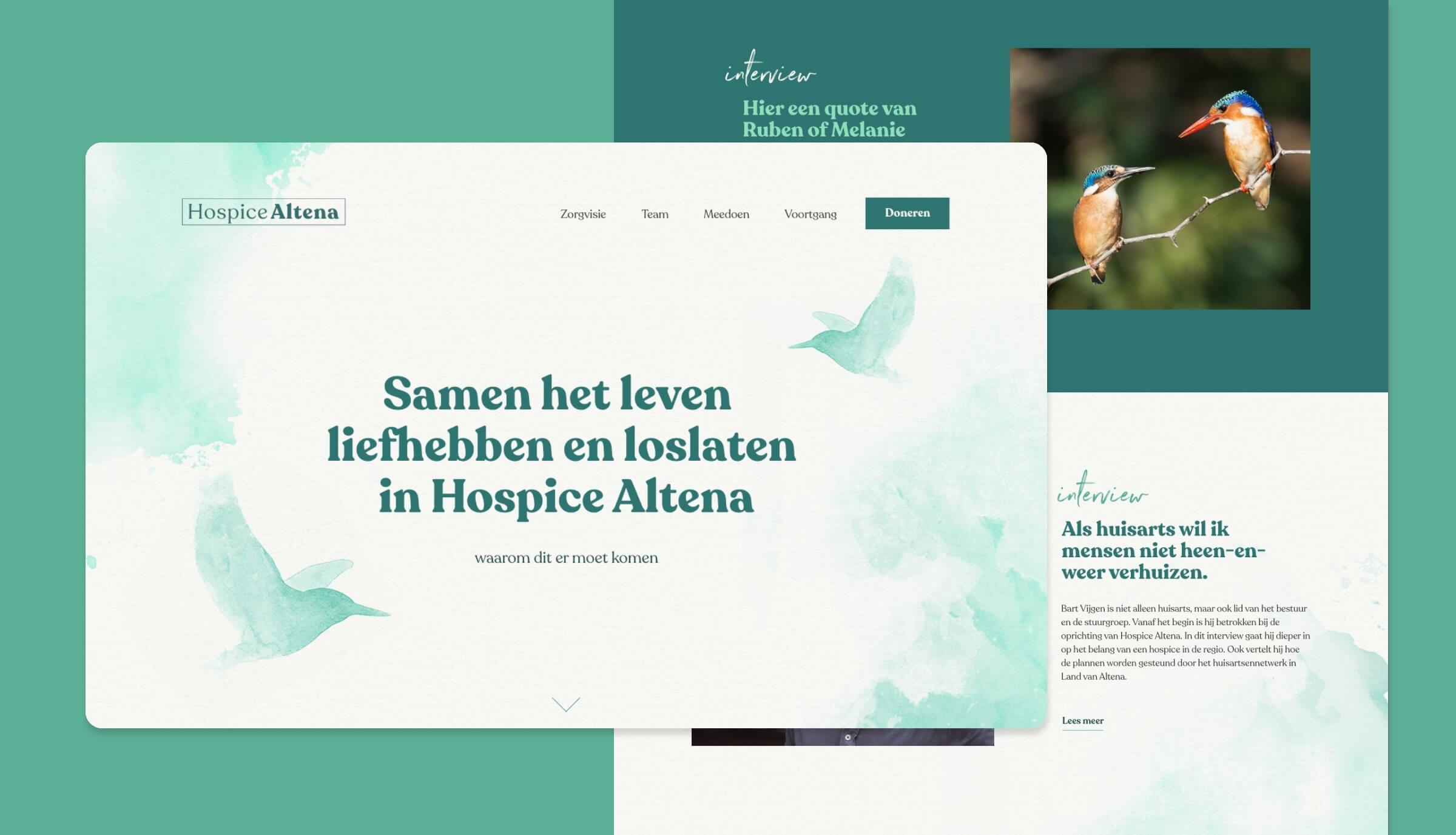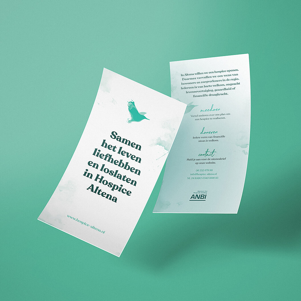 We hebben gekozen voor een ontwerp dat de natuur en de symboliek van de ijsvogel verbindt. Het idee van 'One day I will fly away...' symboliseert het loslaten van het leven. De aquareltechniek geeft een zachte, vloeiende uitstraling die perfect aansluit bij de sfeer van het hospice. Met een zorgvuldig samengestelde kleurenpalet en typografie hebben we een stijl gecreëerd die zowel rustgevend als herkenbaar is.