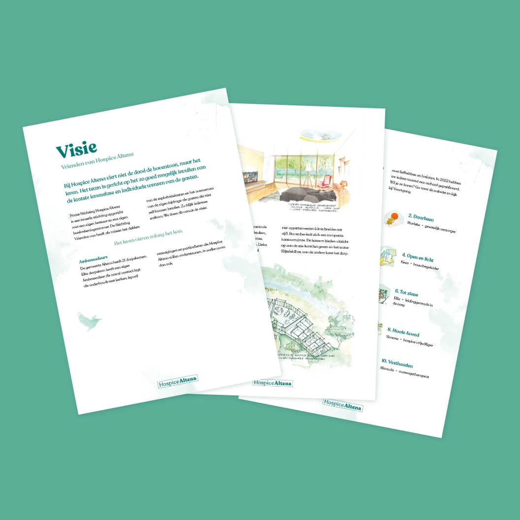 Om deze stijl krachtig en consistent te houden, maakten we een brandguide. Simpel en praktisch. Van kleuren en lettertypes tot beeldgebruik—alles netjes op één lijn. Zo blijft de warme uitstraling van Hospice Altena overal zichtbaar, of het nu om folders, de website of andere communicatie gaat.
